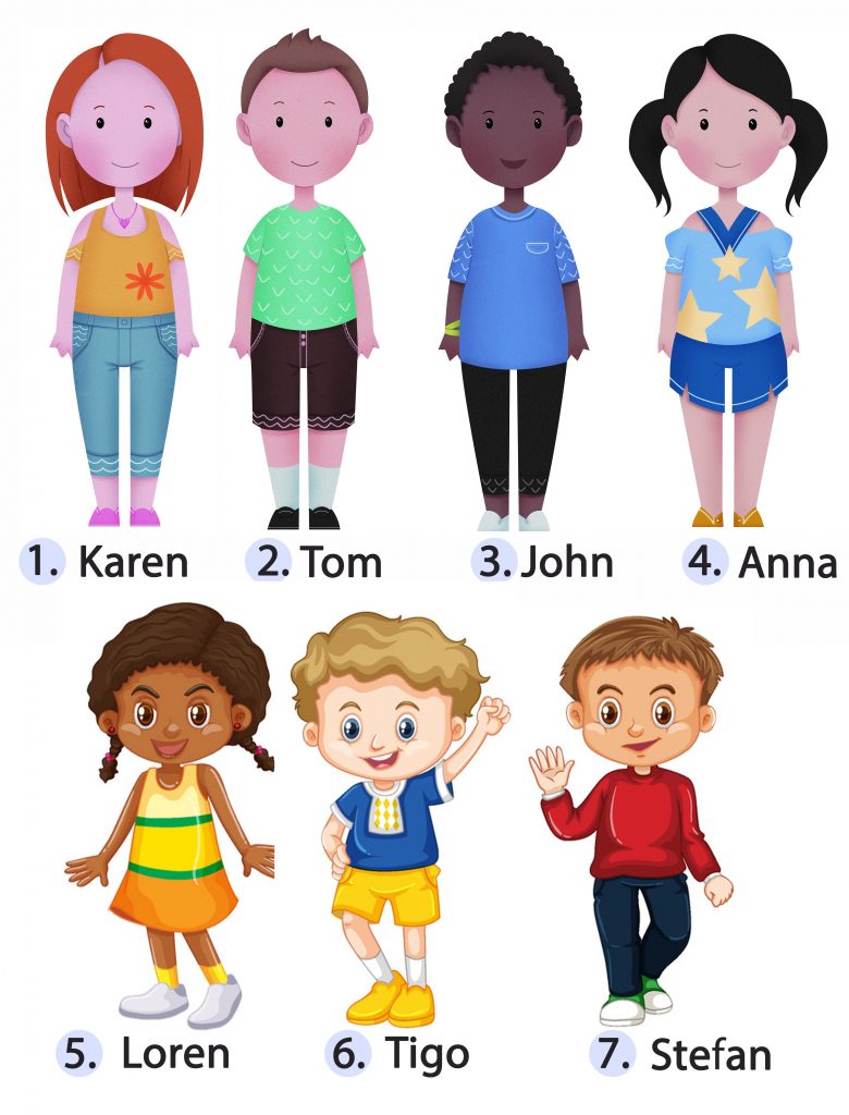 W puste pola wpisz liczbę (cyfra) osoby o której jest opis 🙂 a) Hi! I am wearing yellow shoes, white socks, yellow shorts, and a blue T-shirt. My hair is short and I am happy. b) Hello! I am wearing a yellow T-shirt, blue jeans and pink shoes. My hair is red and I am a girl. c) Hi! I am wearing my favourite blue T-shirt, blue shorts and yellow shoes. My hair is black and I like animals. d) Good morning! I am wearing a red blouse, black trousers and shoes.I am a boy and I love playing football! e) Hi ! I am wearing black shoes, white socks, black shorts, and a green T-shirt. I have got brown, short hair. f) Hello! I am wearing a blue T-shirt, long, black trousers, and white shoes. My hair is short and black. g) Hi! I am wearing white shoes and yellow socks. My dress is yellow and orange. There are green stripes on my dress. Time is Up!