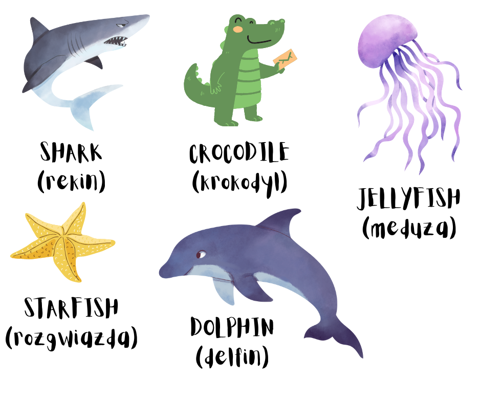 Naucz się słówek oraz wymowy na pamięć 1. Shark – rekin 2. Jellyfish – meduza 3. Starfish – rozgwiazda 4. Crocodile – krokodyl 5. Dolphin – delfin